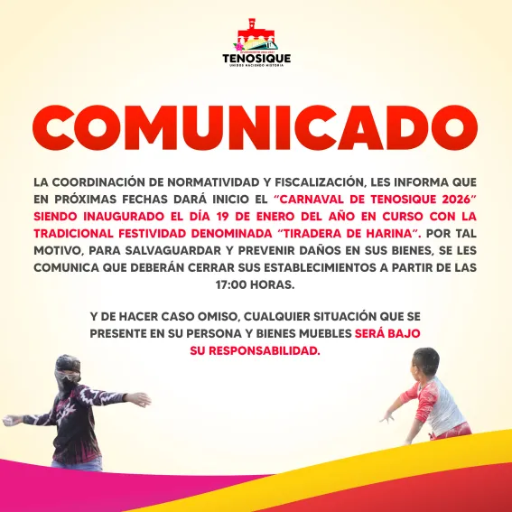 La Coordinación de Normatividad y Fiscalización, recomienda a los comercios de Tenosique cerrar a partir de las 17:00 horas, este lunes 19 de enero, por el inicio del Carnaval con la tradicional tiradera de harina.