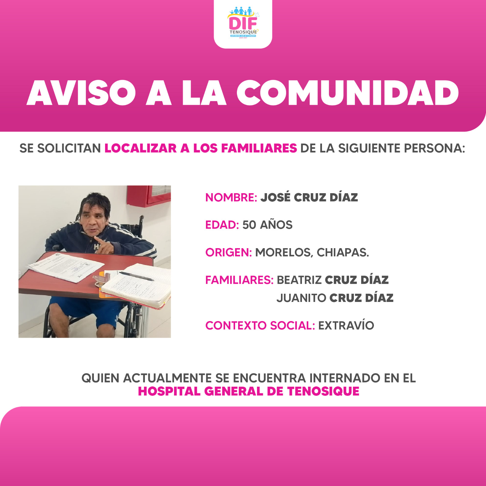 El DIF Municipal de Tenosique, hace un atento llamado a la ciudadanía para apoyar en la localización de familiares del C. José Cruz Díaz, originario de Morelos, Chiapas, quien actualmente se encuentra internado en el Hospital General de Tenosique.