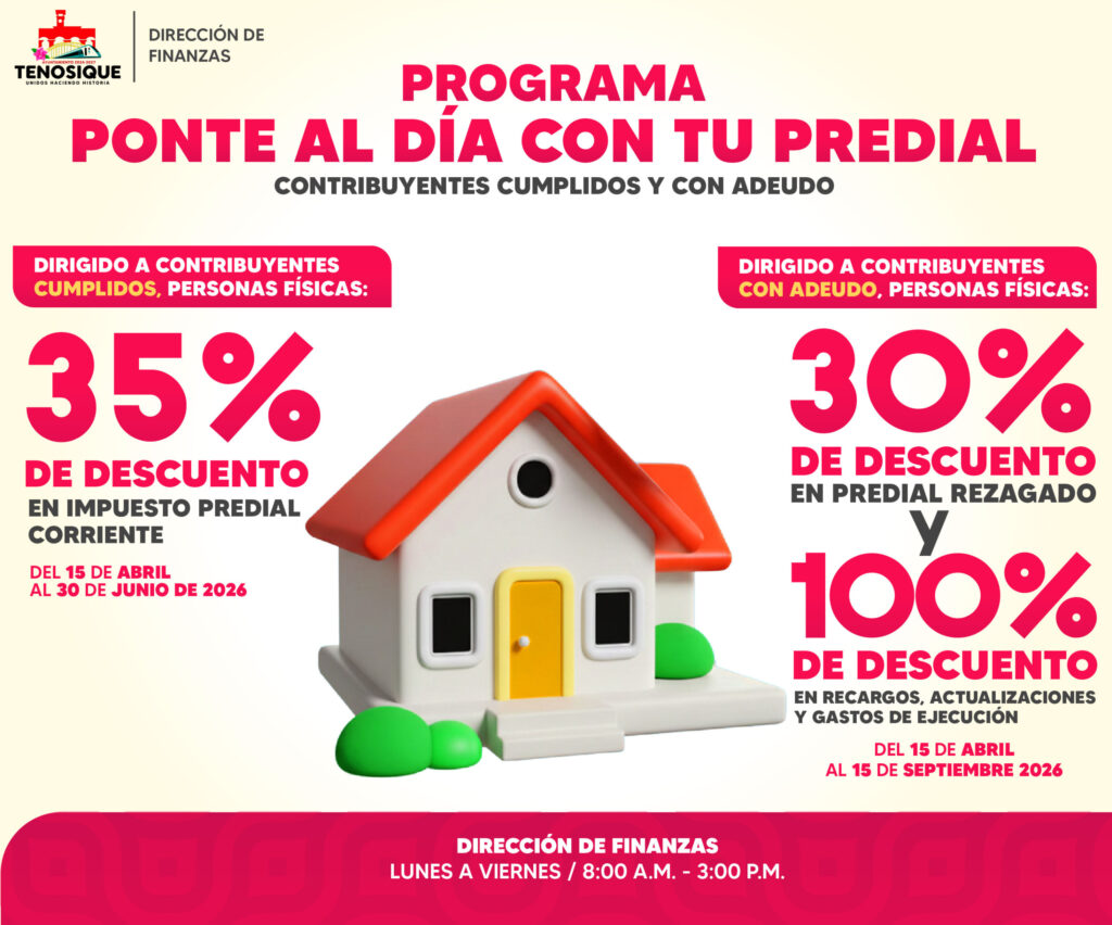 El Ayuntamiento de Tenosique, a través de la Dirección de Finanzas, puso en marcha el programa “Ponte al Día con tu Predial” 2026, con beneficios para contribuyentes cumplidos y morosos.