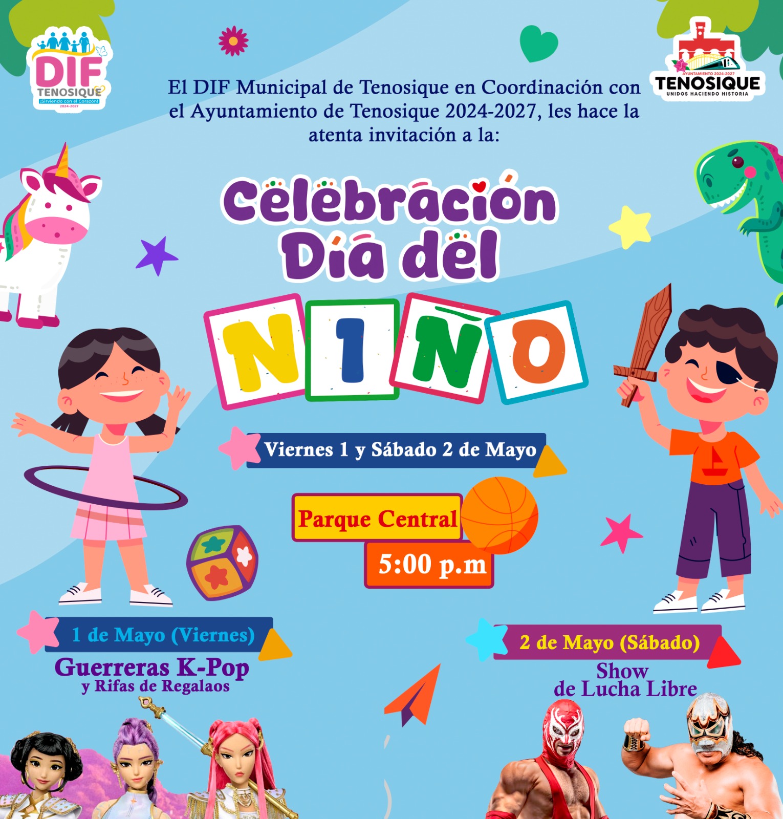 El Ayuntamiento de Tenosique en coordinación con el DIF Municipal, invitan a celebrar el Día del Niño con dos días llenos de alegría, sorpresas y grandes espectáculos.
